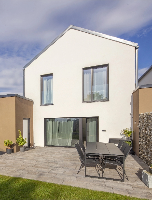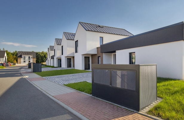 Dvoupodlažní domy jsou jednoduché utilitární stavby vycházející z archetypu rodinného domu. Bílé domy doplňují přidružené dřevěné části skládků, čímž je dosaženo harmonického celku. Přízemní domy jsou jednoduché utilitární stavby citlivě doplňující celou kompozici.